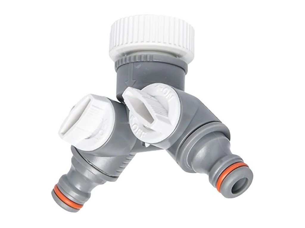 Rozdvojka se připojuje na vodovodní kohoutek pomocí vnitřního závitu 1" a je kompatibilní i s běžným rozměrem 3/4". Na výstupu jsou 2 připojení pro rychlospojky, takže hadice připojíte a odpojíte během vteřiny. Každá větev má vlastní uzávěr s regulací průtoku, což oceníte například při současném zalévání a mytí, nebo když chcete jednu větev úplně uzavřít a druhou nechat v provozu.
