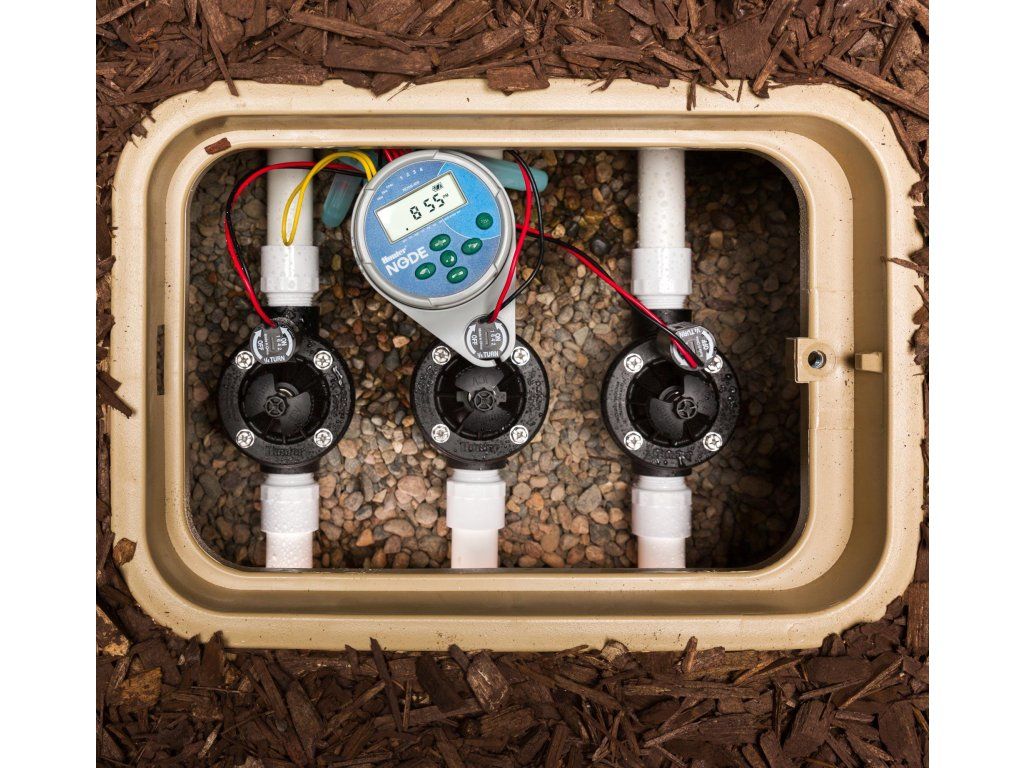 Hunter NODE-BT-400 je špičková vodotěsná řídicí jednotka navržená pro zavlažovací systémy v místech bez dostupného elektrického napájení. Tato jednotka umožňuje řízení až čtyř zavlažovacích sekcí a je kompatibilní s 9V bistabilními cívkami. Ovládání probíhá pohodlně přes Bluetooth aplikaci NODE-BT na chytrém telefonu, což eliminuje potřebu otevírat ventilovou šachtu.