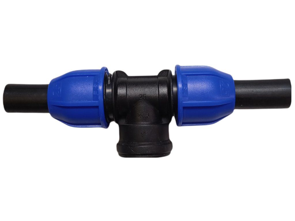 T‑kus PE 25 × 1" vnitřní × 25 je mechanická (kompresní) tvarovka určená pro spolehlivé spojování polyetylenového potrubí a vytvoření závitové odbočky v jednom bodě rozvodu. Na průběžné větvi připojíte PE potrubí Ø 25 mm a na odbočce získáte standardní 1" vnitřní závit, který umožňuje snadné napojení armatur a komponentů se závitem 1" (např. ventily, filtry, redukce, rozdělovače nebo přechody na jiné části instalace).