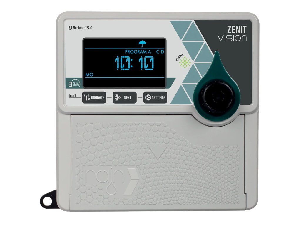 Zenit Vision je moderní řídicí jednotka navržená pro efektivní správu automatizovaných zavlažovacích systémů až s 8 sekcemi. Je vhodná pro vnitřní i venkovní instalace a podporuje 24 V AC elektromagnetické ventily. Díky technologii Bluetooth 5.0 a možnosti připojení k Wi-Fi síti pomocí modulu Nuvola Vision nabízí jednotka vzdálené ovládání přes mobilní aplikaci Rain Vision App, což umožňuje pohodlnou správu zavlažování odkudkoliv.
